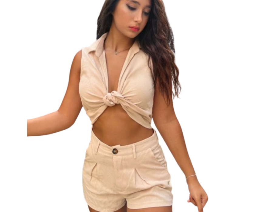 This women’s set features a cropped top with a front knot detail paired with tailored high waist shorts for a chic, modern silhouette. Crafted from lightweight, smooth fabric, it offers comfort while maintaining a polished look. Style it with sandals or heels and simple accessories for a refined daytime or summer evening outfit.