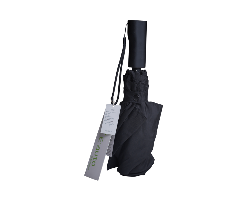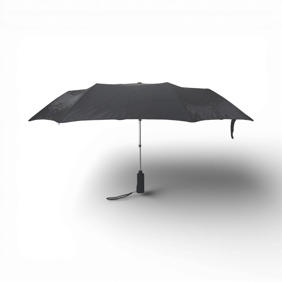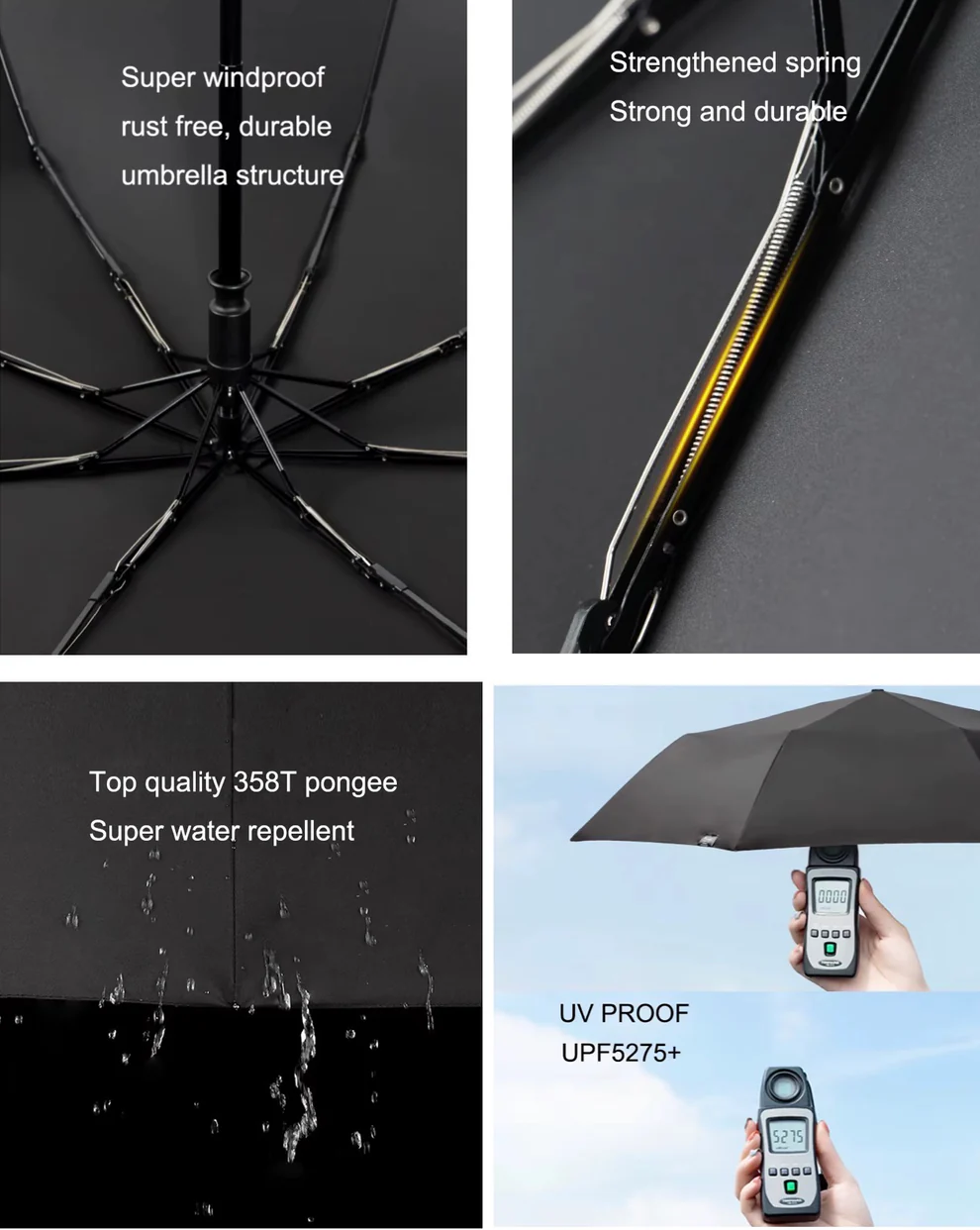 This luxury three-folding umbrella features a 118 cm arc and a fully automatic open/close system. Crafted from 358T Pongee fabric, it is supported by a steel shaft and eight reinforced fiberglass ribs for superior wind resistance. The design includes a rubber-coated handle for a secure grip and a super-safe mechanism for reliable daily use. Simply press the button for instant rain protection and a sleek, modern look. Please check dimensions prior to ordering to ensure a proper fit as this product includes the umbrella and matching sleeve only.