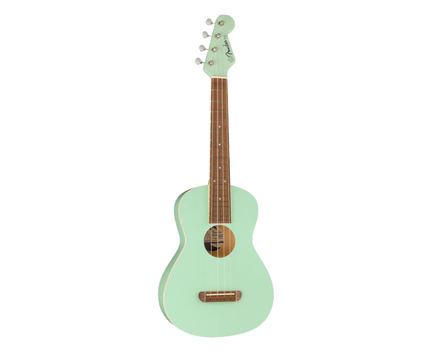 The Fender Avalon Tenor Ukulele from the California Coast Series features a laminated basswood body, slim C shaped neck, walnut fingerboard, no tie bridge, open back geared tuners, 17 inch scale length, and satin Surf Green finish for warm tone and deeper resonance. Ideal for beginner to intermediate players, it suits strumming or fingerpicking at home, studio, or beach sessions, and can be styled casually with a shoulder strap for relaxed performances.