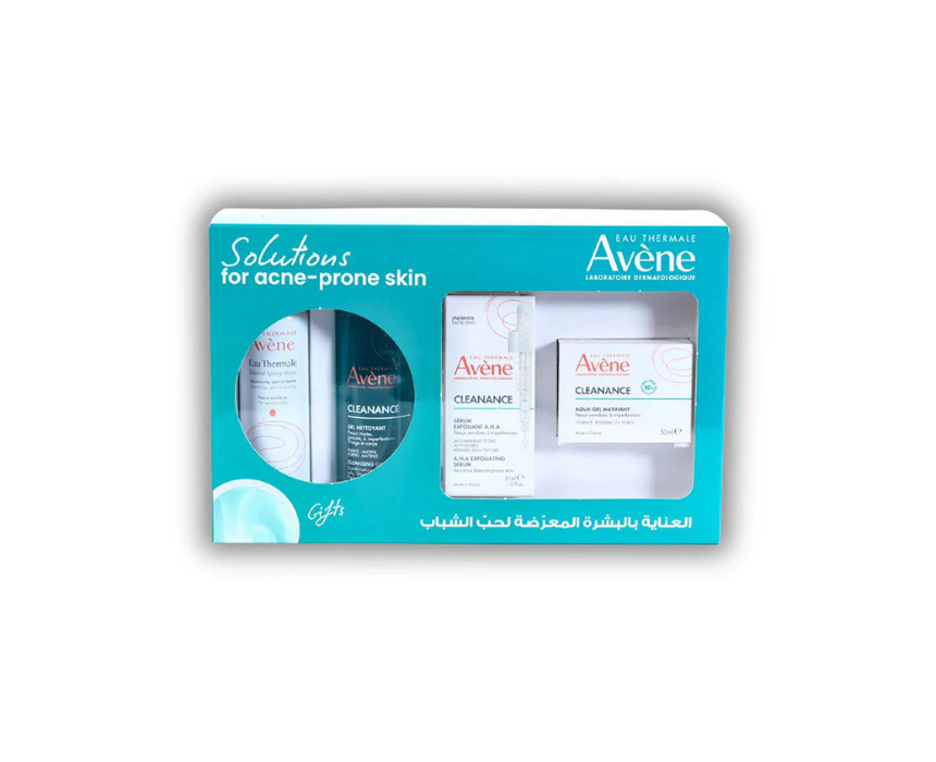 The Avene Kit for Acne Prone Skin includes Aqua Gel 50 ml, Serum 30 ml, and free Gel Nettoyant & Eau Thermale Spray, offering a complete routine to cleanse, soothe, and reduce blemishes. Ideal for daily use, this kit helps maintain clear, hydrated skin while calming irritation and controlling excess oil. Perfect for sensitive and acne-prone skin types.