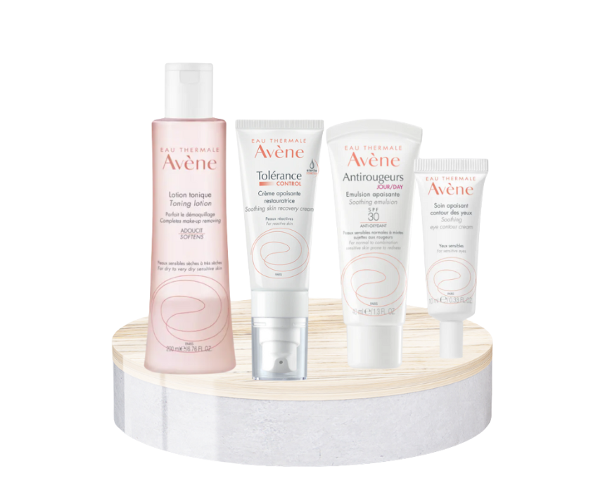 This gentle skincare routine soothes, hydrates, and protects sensitive skin while reducing redness and irritation. Featuring toner, recovery cream, SPF30 emulsion, and eye contour treatment enriched with thermal spring water, it restores the skin barrier, calms discomfort, and keeps skin soft, comfortable, and healthy-looking. Apply each product as directed to face, neck, and eye areas for daily protection and care.