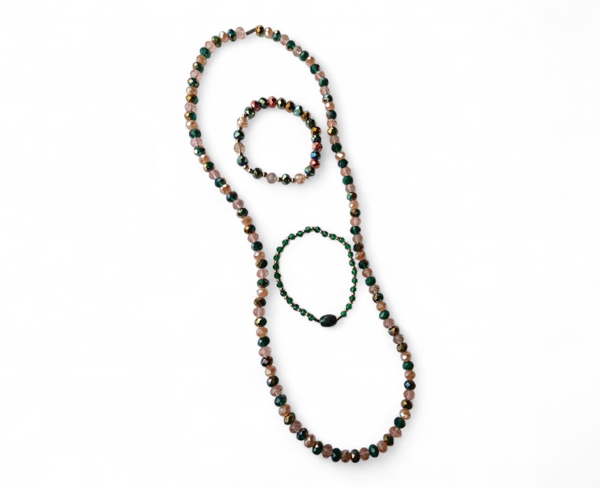 Embrace earthy elegance with the “B.G.Crystals” handmade jewelry set. This coordinated collection includes one long necklace and two matching bracelets, all meticulously crafted with a harmonious blend of beige, brown, and green colored crystals. The natural palette makes it a versatile accessory for any season, adding a sophisticated sparkle to both casual and professional attire. Each piece is designed for comfort and durability, ensuring a timeless artisan finish. Long length.