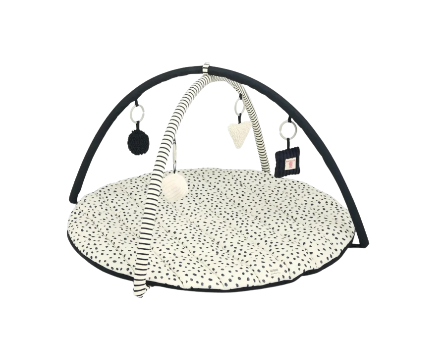 Designed for newborns and young infants, this sensory activity play mat features a soft padded base with high contrast patterns to support early visual development and engagement during tummy time or supervised play. It includes multiple interactive elements such as crinkle, rattle, squeaker, chime features, and detachable hanging toys to encourage sensory exploration and motor skill development. The super soft construction makes it suitable for daily use at home, providing a comfortable space for play, rest, or bonding time.