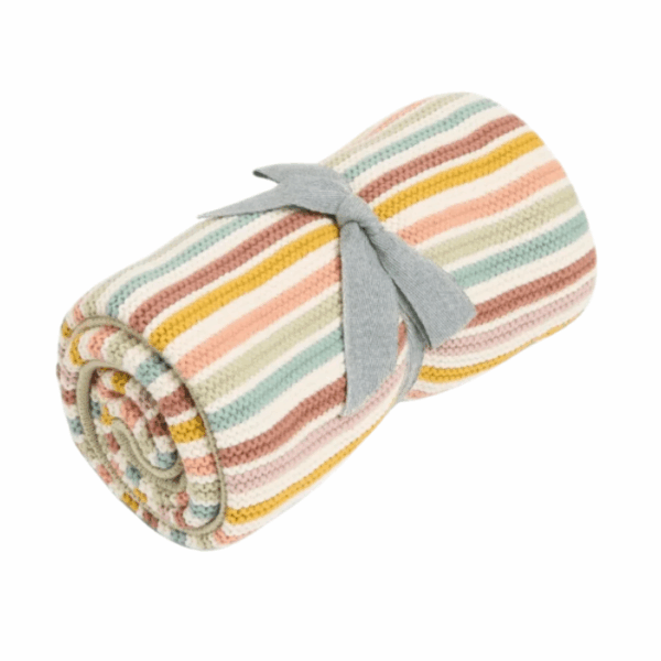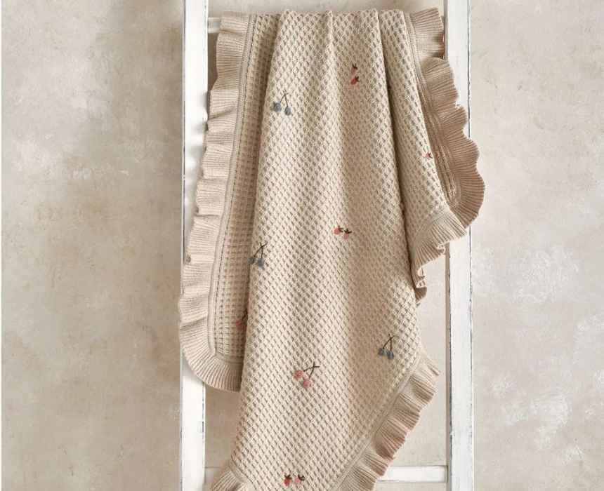 The knitted blanket features a lightweight waffle-effect 100% cotton design with delicate berry and flower bud embroidery and a soft frilled edge. Its breathable and gentle texture makes it ideal for newborn comfort, while the earthy neutral base with subtle floral accents adds charm for nursery use, pram outings, or everyday cuddles, and it is machine washable for easy care.
