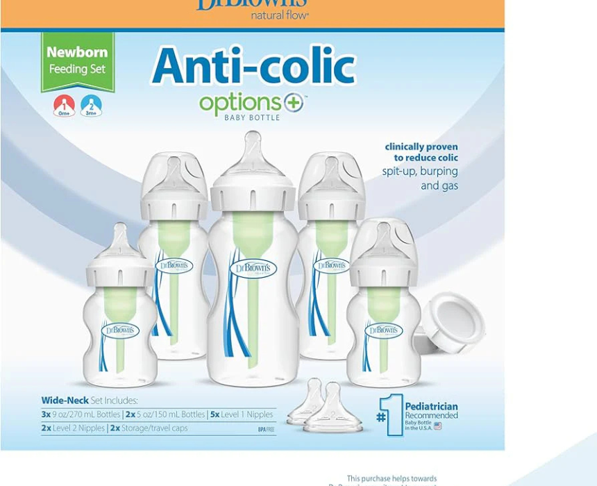 Dr. Brown’s Natural Flow Options Plus wide neck bottle set includes five bottles in two sizes, level two nipples, and travel caps for convenient newborn feeding at home or on the go. Designed with a breast like shape and anti colic vent system to reduce gas, spit up, and discomfort, it provides consistent flow and can be used with or without the vent, making feeding comfortable and flexible.