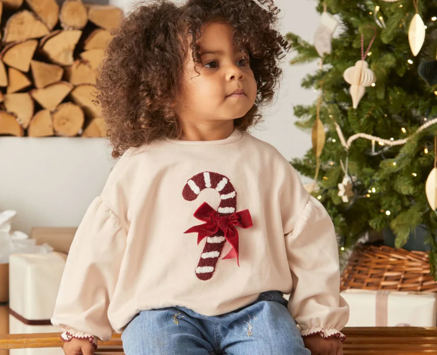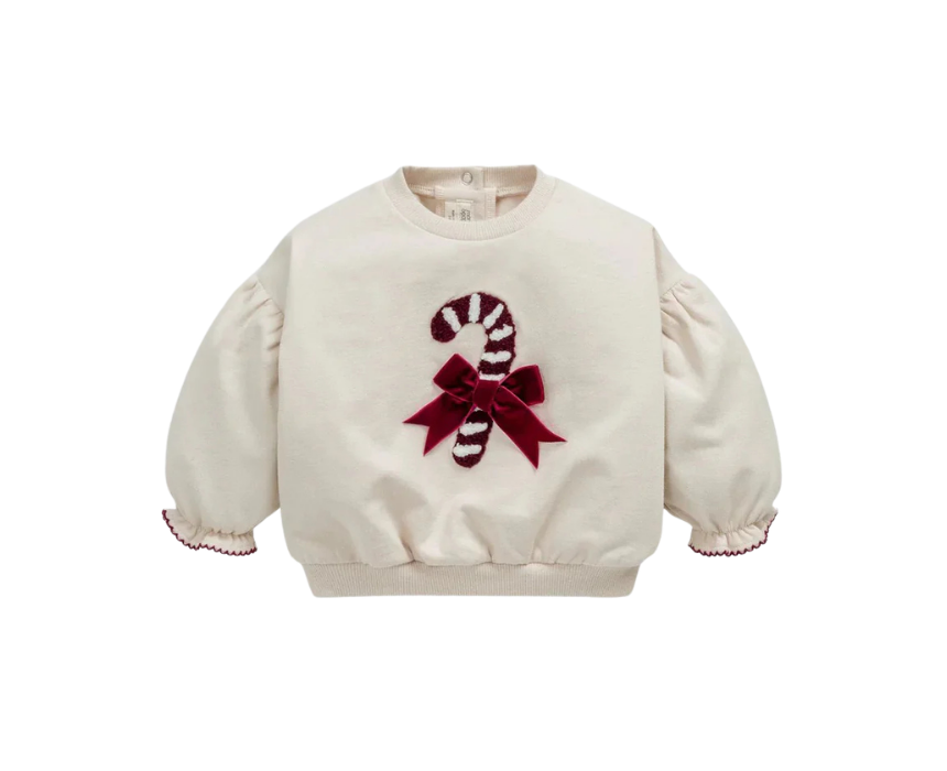This baby girls candy Christmas jumper features adorable candy cane detailing with boucle embroidery and a velvet bow for a festive touch. Designed with long sleeves, elasticated frill cuffs, and a concealed back popper opening, it ensures both comfort and easy dressing. Perfect for holiday celebrations, it pairs beautifully with skirts or leggings for a sweet seasonal look.