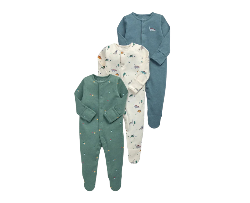 This 3-pack of baby boys long-sleeved sleepsuits is made from 100% soft cotton, featuring enclosed feet and front and gusset popper fastenings for easy dressing and diaper changes. The set includes a pebble dinosaur print, a dusky green print, and a shaded blue sleepsuit with boucle and embroidered dinosaur detail. Perfect for cozy nights, they keep little ones snug and comfortable.
