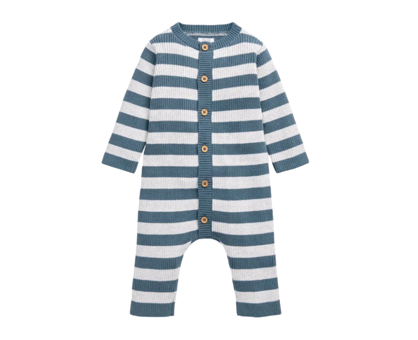 This baby boys knit stripe romper features a soft petrol blue and oatmeal palette, making it a stylish and versatile wardrobe staple. Designed with a ribbed collar, cuffs, and hems along with a front button fastening, it ensures comfort and easy dressing. Perfect for everyday wear, it keeps little ones cozy while maintaining a smart look.