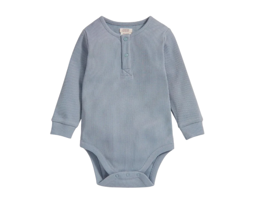 This baby boys ribbed bodysuit in soft blue is crafted from stretchy, comfortable fabric for all-day wear. Featuring long sleeves, a round neckline, and popper fastenings at the gusset for easy changing, it’s perfect for layering or wearing on its own. Soft, practical, and stylish, it’s an essential wardrobe staple for little ones.
