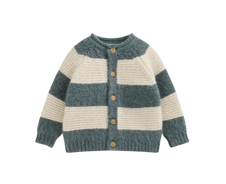 This baby boys striped knit cardigan features a soft, cozy fabric with a classic stripe pattern. Designed with a front button opening, it’s easy to put on and take off, making it perfect for layering on cooler days while keeping little ones comfortable and stylish.