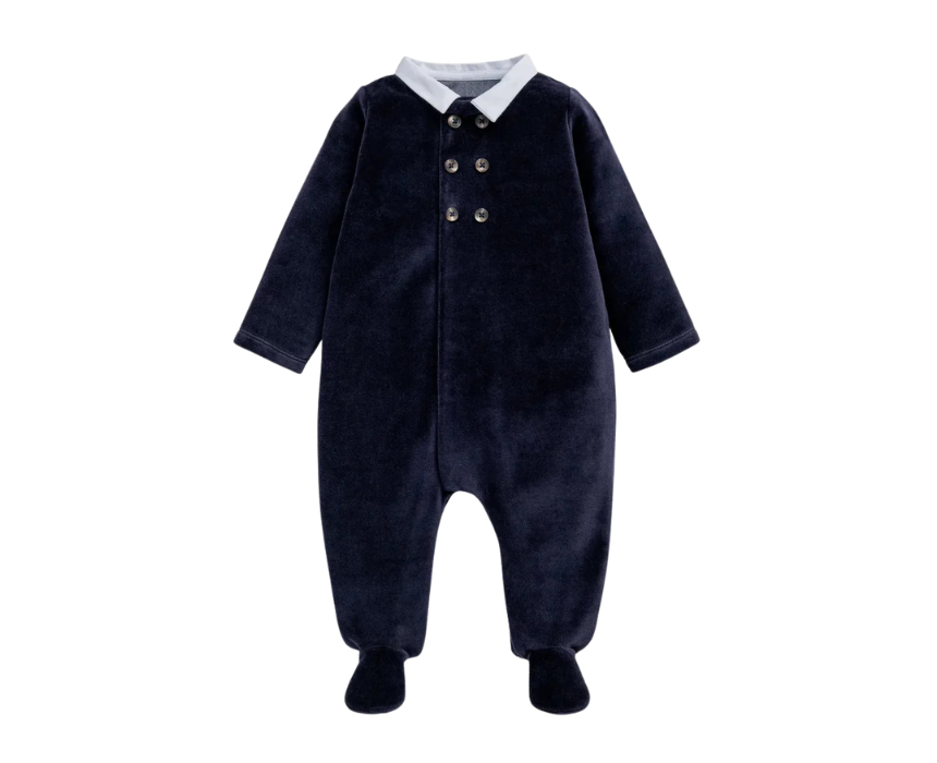 This baby boys blue velour sleepsuit is crafted from super-soft fabric to keep little ones warm, snuggly, and comfortable. Featuring a smart collared design with a double-breasted style and concealed front and crotch popper openings, it ensures easy dressing and a polished look. Perfect for bedtime or lounging, it combines coziness with elegant style.