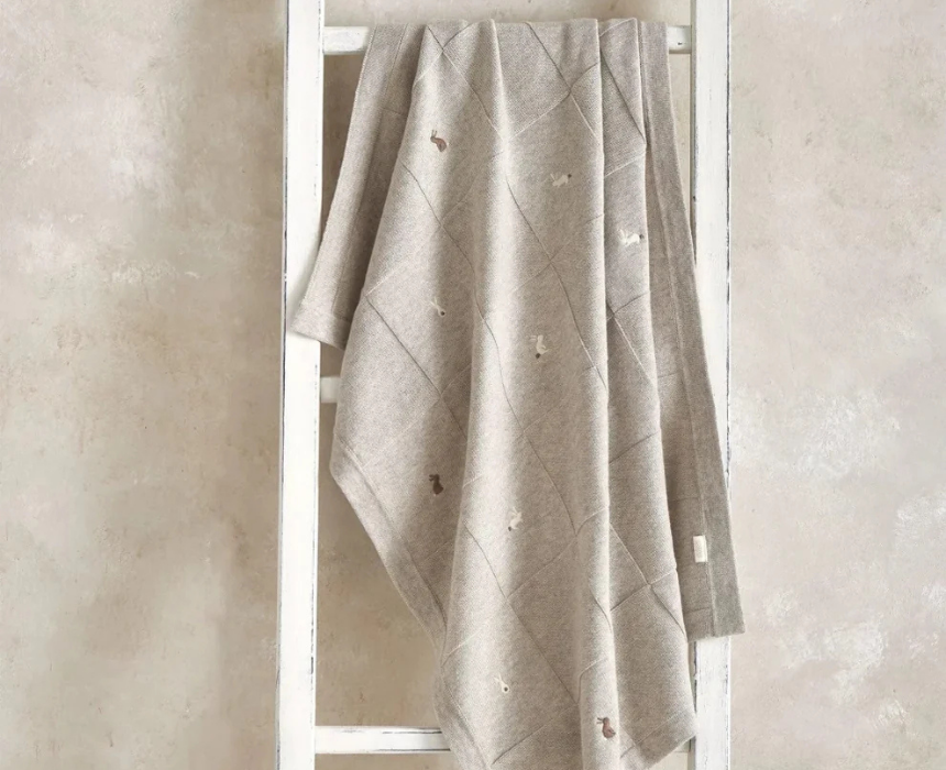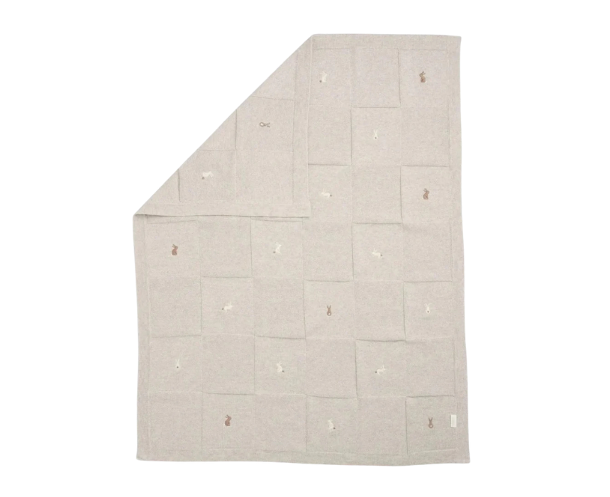The knitted blanket features a soft 100% cotton construction in gentle grey and neutral tones, with a patchwork knit design and delicate embroidered bunny details. Its cozy yet breathable texture makes it perfect for newborn comfort, whether used in the nursery, crib, or pram, while its machine washable fabric ensures easy care and everyday practicality.