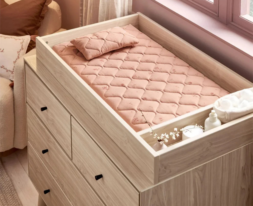 Designed for comfort and support during diaper changes, this luxury changing mat features soft padded construction with quilted detail and an integrated pillow for added ease. Made with a gentle cotton cover, it provides a cozy surface suitable from birth while ensuring practicality for everyday use. Easy to maintain, it offers a safe and comfortable changing experience at home.