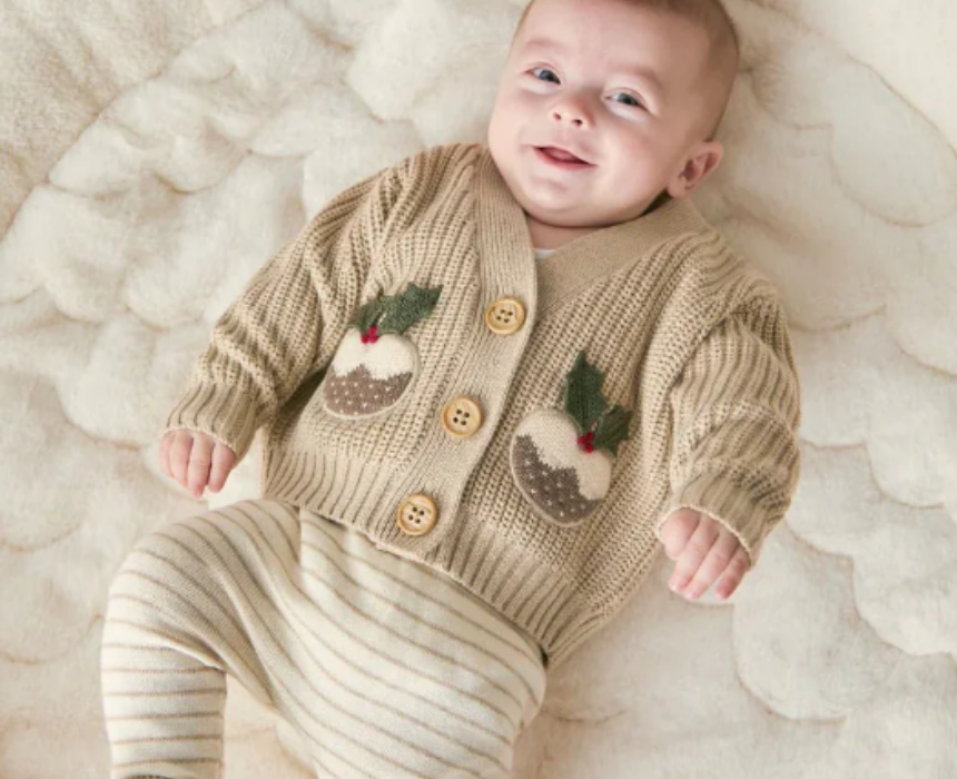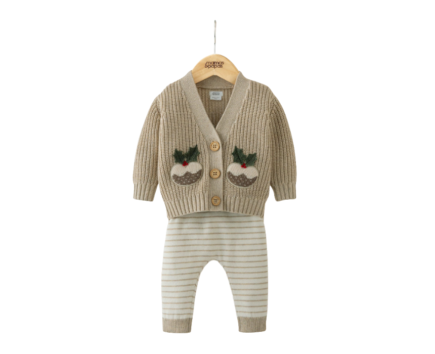 This baby Christmas “Little Pudding” knitted outfit set includes a chunky-knit button-up cardigan with festive pudding and lettering details, paired with matching striped leggings featuring a contrast ribbed waistband and hems. Soft, cozy, and stylish, it’s perfect for holiday celebrations and keeping little ones comfortable.