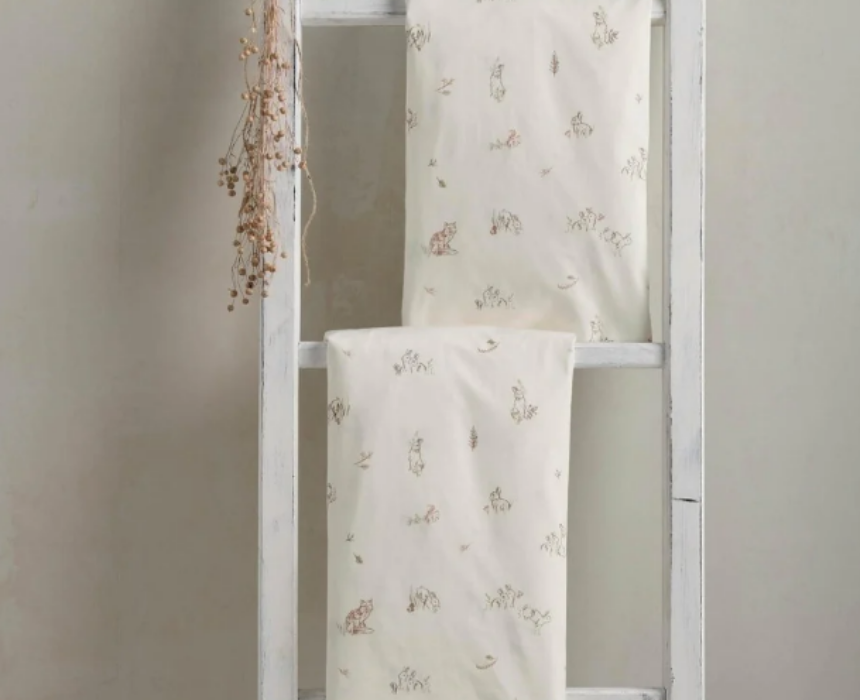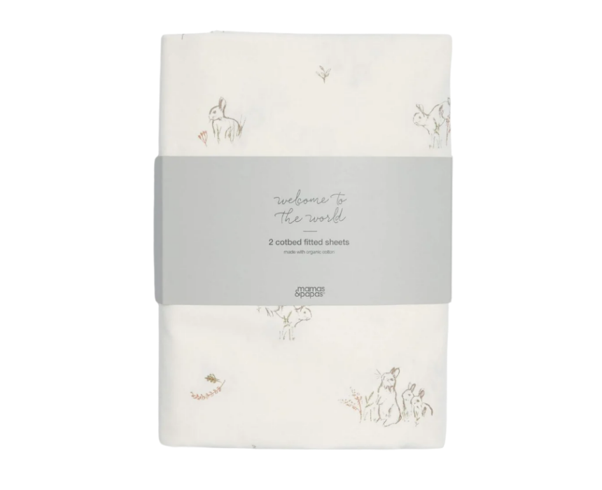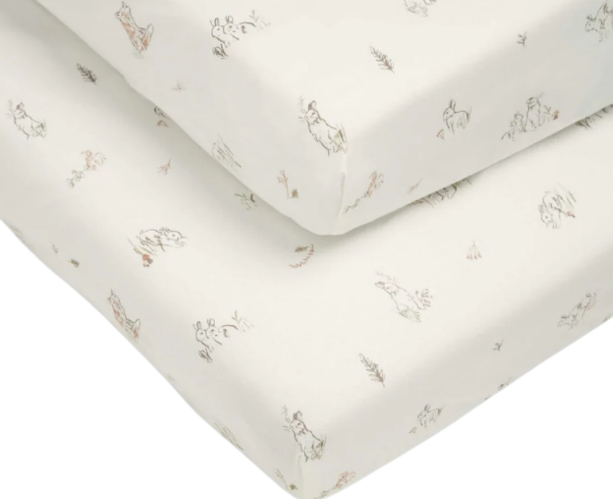 This pack of fitted cotbed sheets includes two soft designs featuring bunny and fox patterns, crafted from 100 percent cotton for a gentle and breathable sleep surface. Designed with an elasticated fit, they secure easily onto most cotbed mattresses for a snug and comfortable rest. Machine washable and durable, they maintain their softness and natural stretch wash after wash for everyday nursery use.