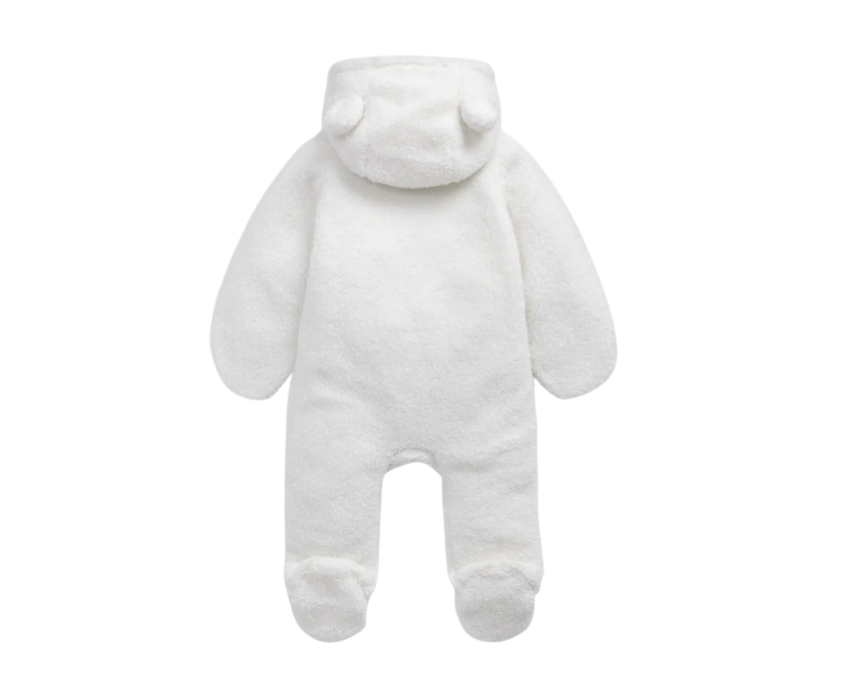 This baby cream borg pramsuit features super-soft fabric with a hood adorned with 3D bear ears for extra cuteness. The front zip fastening makes dressing easy, while the cozy design keeps little ones warm and comfortable during outings. Perfect for chilly days, it’s a stylish and practical winter essential.