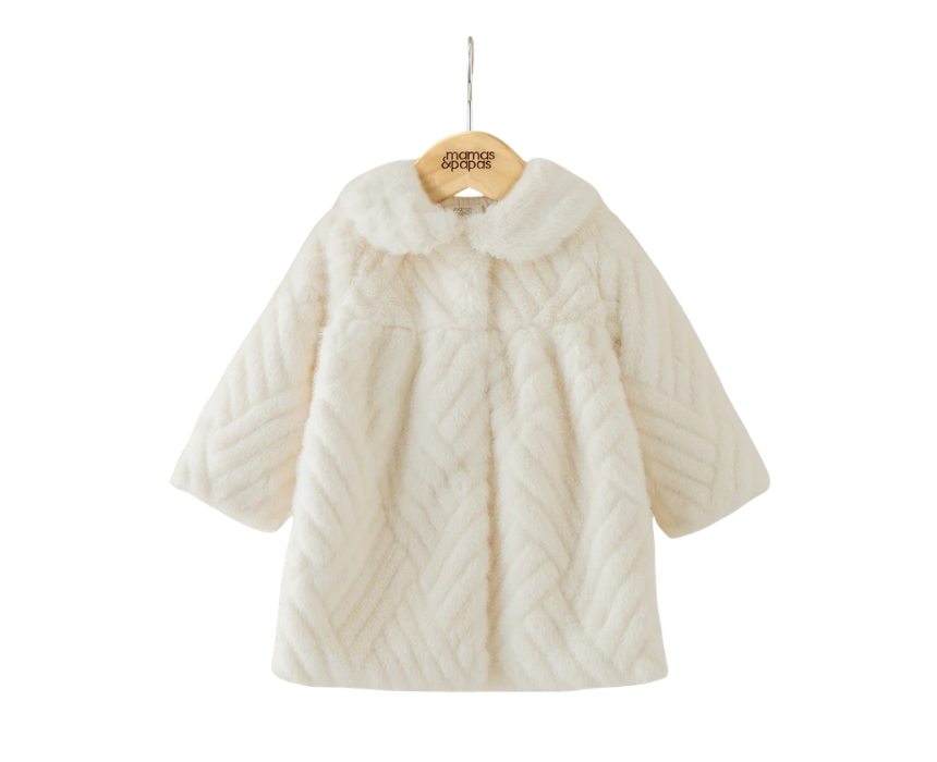 This baby cream faux fur coat is crafted from super-soft fabric, perfect for keeping little ones warm and stylish on dressy days and special occasions. Featuring long sleeves, a concealed popper fastening, and full lining on the body, collar, and sleeves, it offers both comfort and elegance.
