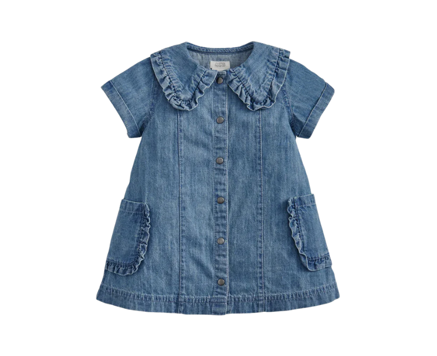 This baby denim shirt dress features an A-line shape, Peter Pan collar with frill, and functional front snap fasteners for easy dressing. Short sleeves with turn-back cuffs and side pockets with frill detailing add charm and practicality. Stylish and comfortable, it’s perfect for everyday wear or special outings.