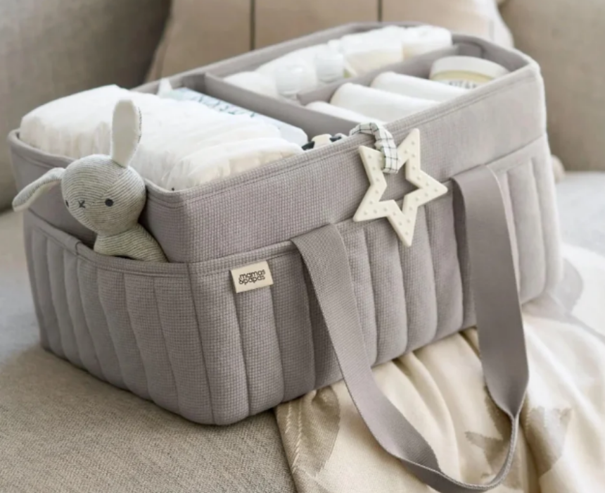 Designed to keep changing essentials neatly organized, this soft cotton caddy features multiple inner compartments with removable inserts and outer pockets for smaller items. Its lightweight design with sturdy handles makes it easy to move between rooms, while the foldable structure allows compact storage when not in use. A practical and stylish solution for everyday baby care.