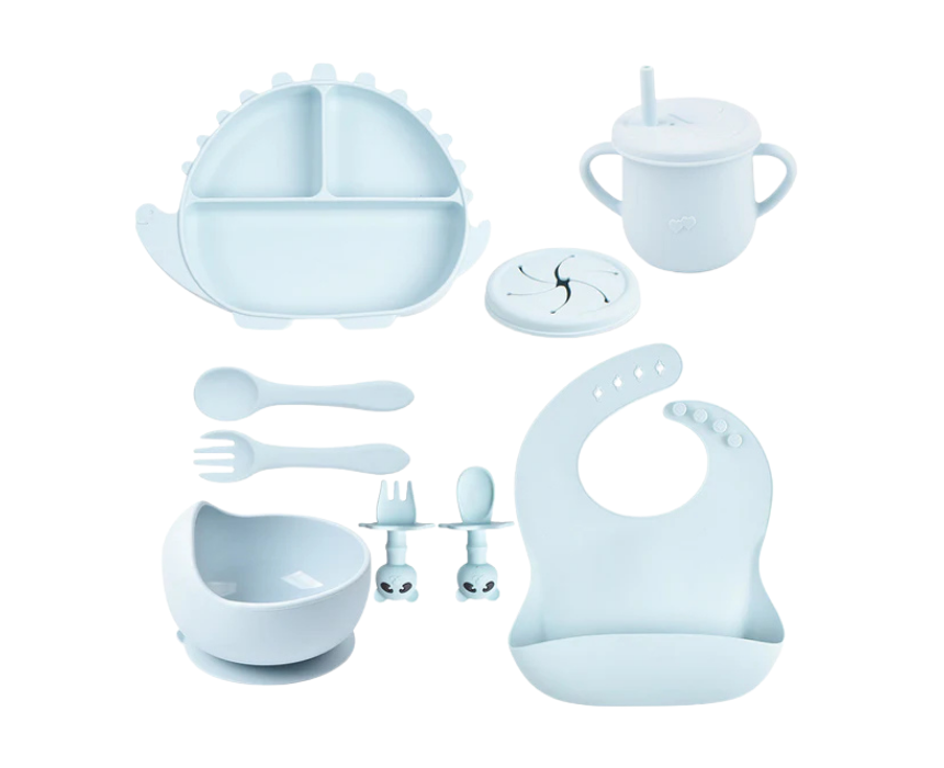 The Baby Feeding Set Turtle includes 9 essential pieces designed to support safe and independent mealtime. Crafted from food-grade, BPA-free silicone, it features a suction plate, bowl, sippy cup, utensils, and bib to reduce spills and encourage self-feeding. Durable, non-slip, and easy to clean, it makes everyday meals simple and enjoyable for little ones.