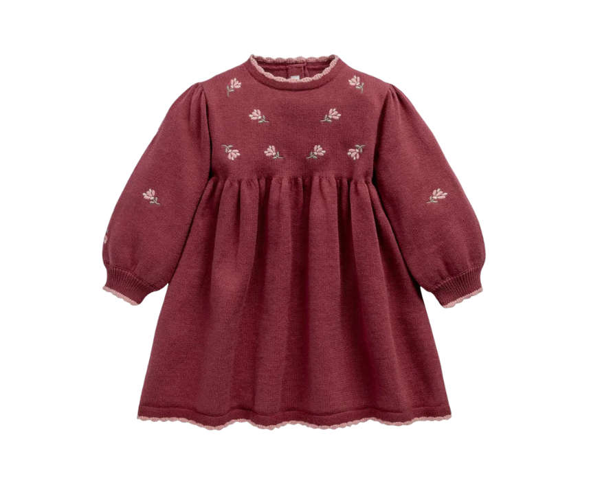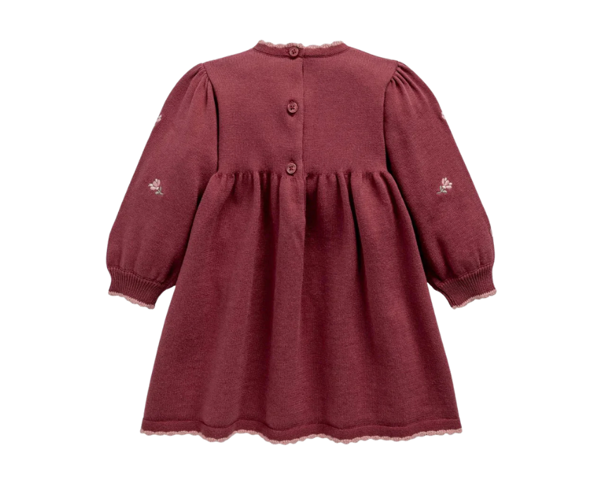 This baby floral embroidered dress features delicate floral embroidery, a scallop-edged neck and hem, long sleeves, and a back button opening. Soft and cozy, it’s perfect for both everyday wear and special occasions.