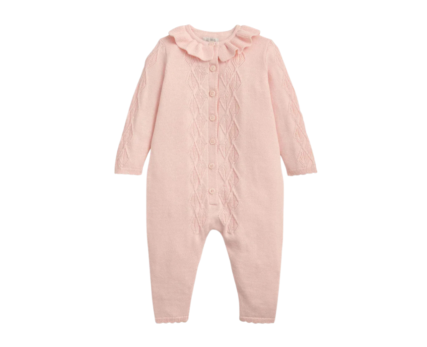 This baby girls’ pink knitted romper features a charming diamond stitch pattern, ribbed scalloped-edge cuffs, a frill collar, long sleeves, and a front button opening. Made from 100% cotton, it’s soft, cozy, and perfect for everyday wear or special occasions.