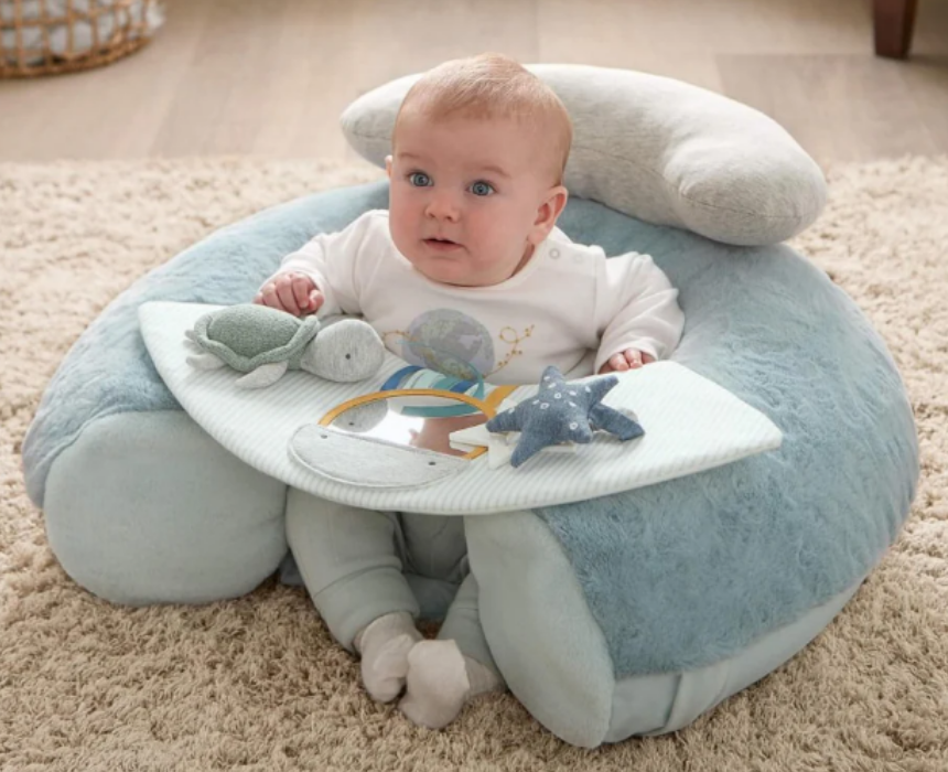 This baby sit and play floor seat is designed to support infants who can sit unaided while encouraging safe and engaging independent play. It features a soft inflatable base with a raised back for stability, along with a detachable activity panel that includes sensory toys such as a rattle, teether, crinkle and squeak elements, a plush toy, and a baby mirror to support visual and motor skill development. Made from soft fabrics in calming tones, it provides a comfortable and stimulating play environment for everyday use.