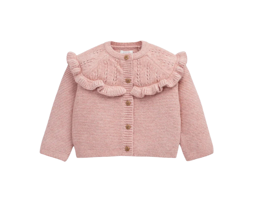 This baby soft pink knitted cardigan features long raglan sleeves, delicate knitted frill detailing, and a mock wood button fastening. Perfect for cooler seasons, it keeps little ones warm, cozy, and stylish for everyday wear or layering over outfits.