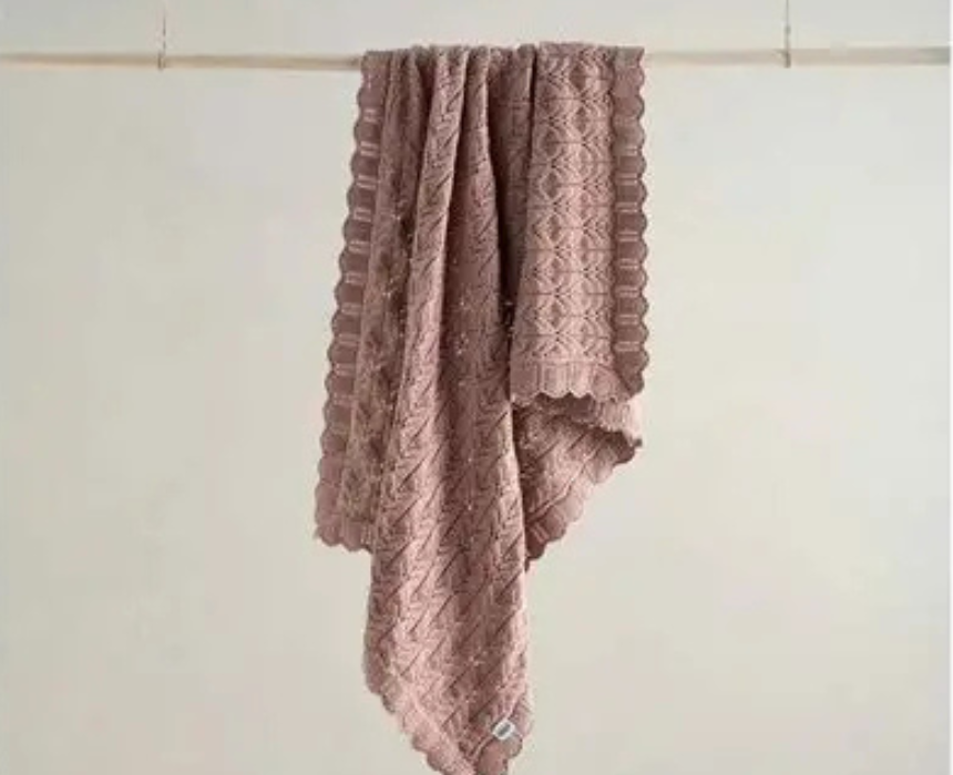 This knitted baby blanket features a delicate dusty peony tone with scalloped edges, adding a soft and elegant touch to any nursery. Made from 100 percent organic cotton, it is lightweight, breathable, and gentle on delicate skin, making it ideal for warmer days. Suitable from birth, it provides cozy comfort for use in a cot, pram, or during everyday cuddles.