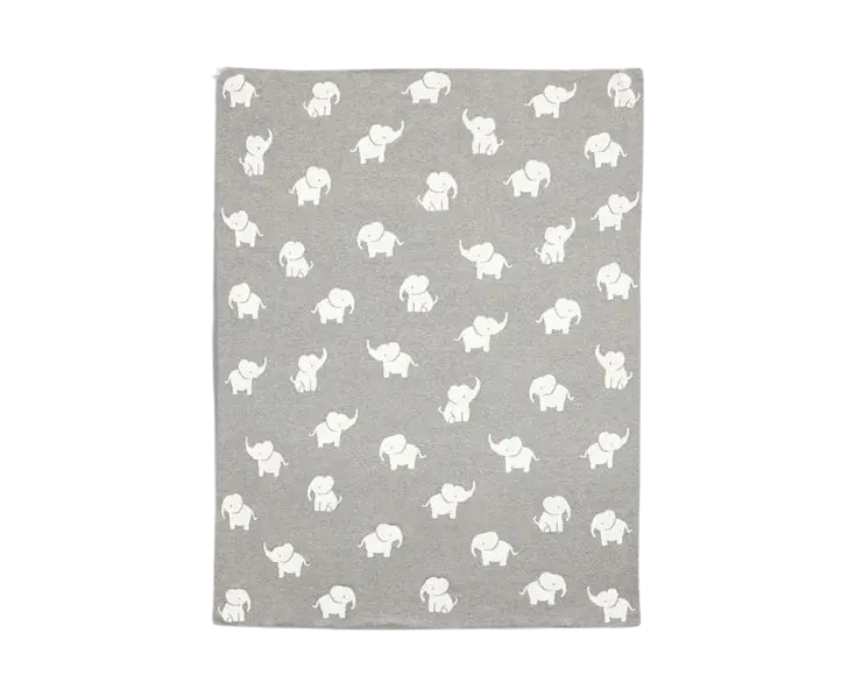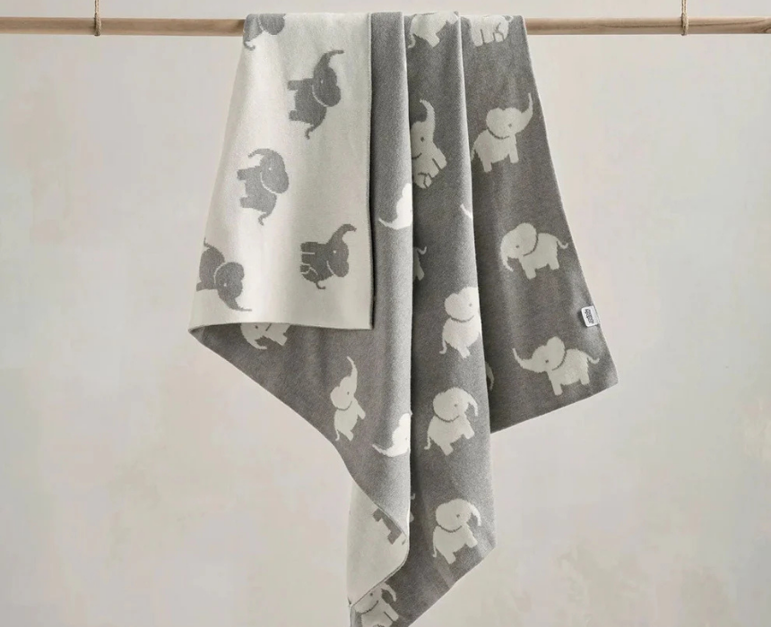 This soft knitted baby blanket features a charming elephant design in a gentle grey tone, adding warmth and style to any nursery. Crafted for comfort, it provides a cosy and soothing layer for babies whether at home or on the go. Ideal for everyday use, it helps keep little ones snug while complementing a range of nursery décor styles.