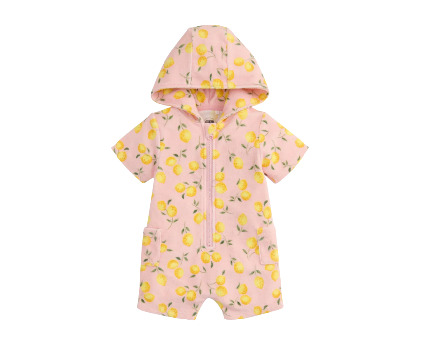 This baby girls’ lemon print towel romper is perfect for post-swim or splash time, crafted from soft, textured towelling to keep little ones dry and cozy. Featuring a hood, long sleeves, front patch pockets, and a front zip fastening, it combines practicality with playful style for everyday use.