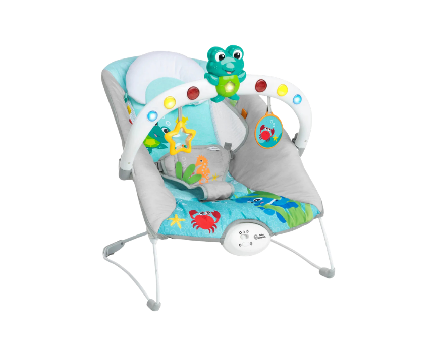 Designed for newborns, this baby musical bouncer seat provides an engaging and soothing space with motion activated lights, music, and ocean sounds to support early development. It features multiple play modes, gentle vibration, and a removable toy bar with sensory elements like a mirror and rattle to encourage interaction and motor skills. A soft headrest, secure three point harness, and easy to clean seat ensure comfort and safety for everyday use up to 20 pounds.