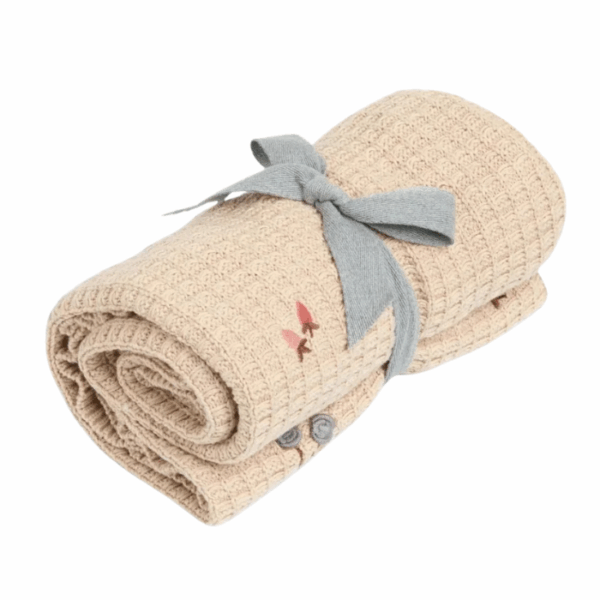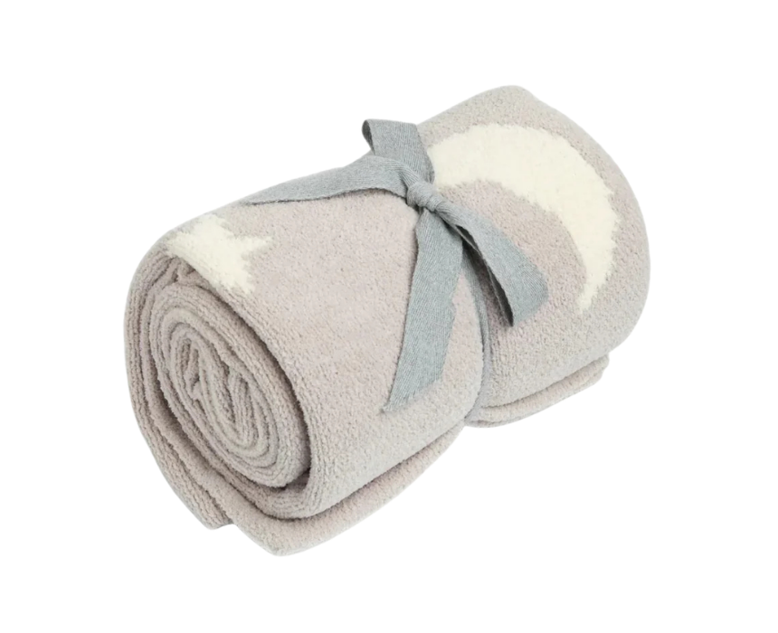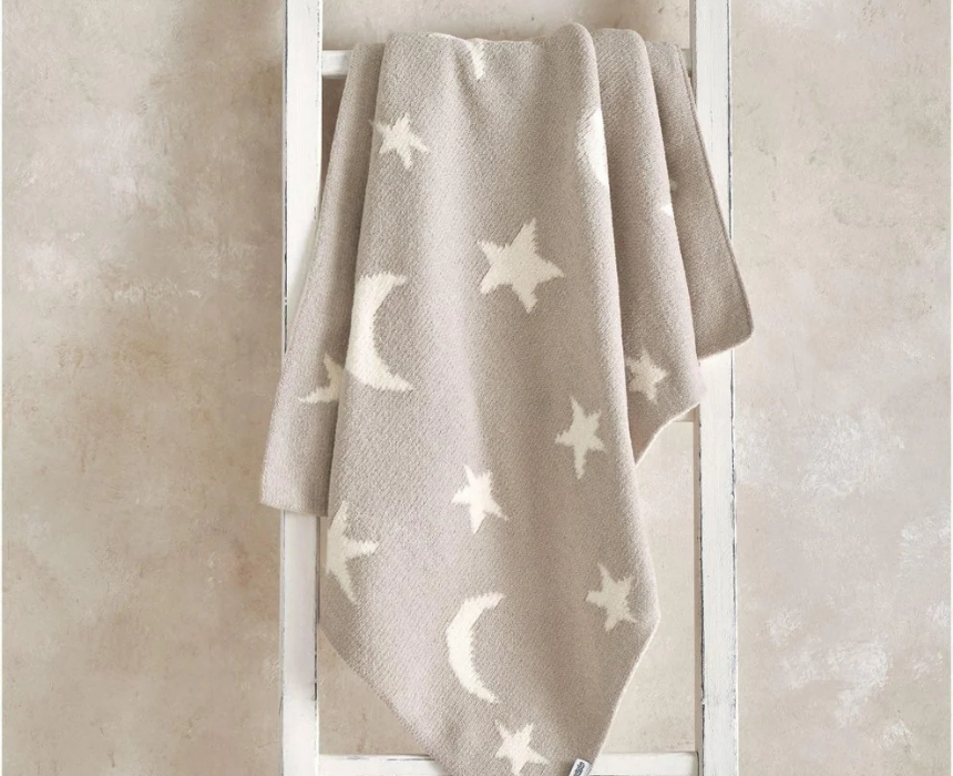 The chenille blanket is designed in a soft neutral greige tone with a reversible celestial moon and star print for versatile styling. Its ultra-soft, warm texture makes it ideal for newborn cuddles, nursery use, or pram outings, while the machine washable fabric ensures easy everyday care and long-lasting comfort.
