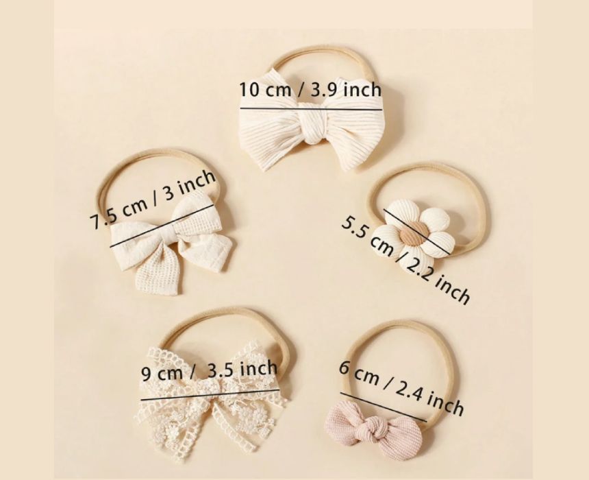 This 5-piece off-white baby headband set features a beautiful mix of florals, lace, bows, and heart accents. Made from soft, stretchy materials, each headband offers a gentle fit for all-day comfort and style. Ideal for baby photoshoots, special occasions, or everyday elegance with any outfit.
