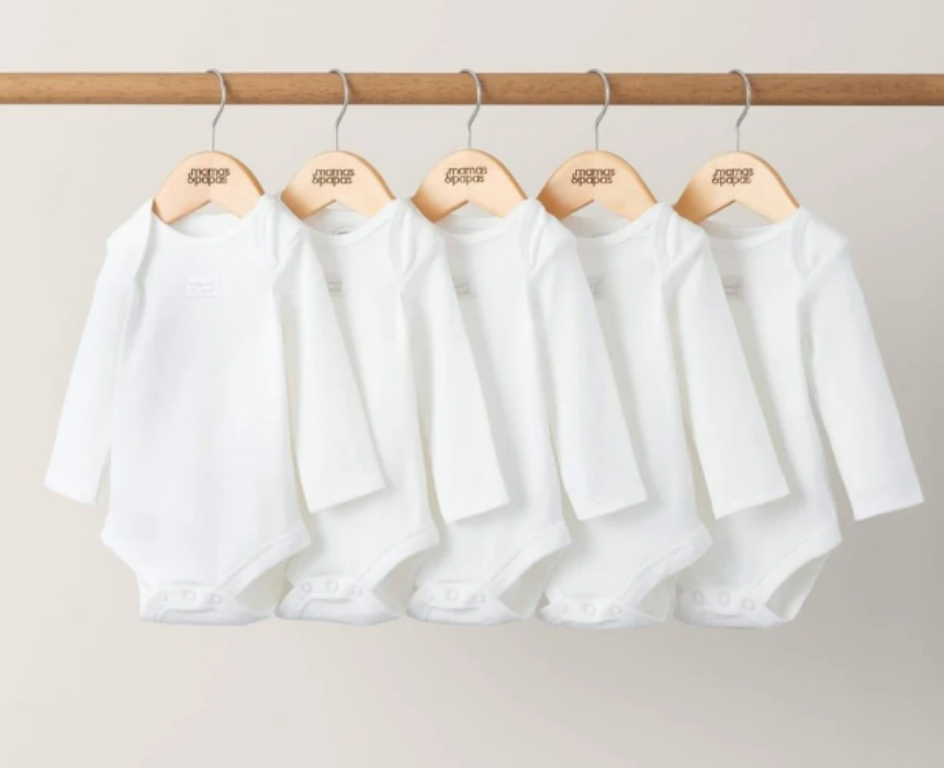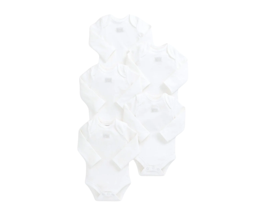 This 5-pack of baby organic long-sleeved bodysuits is made from supersoft cotton, gentle on delicate newborn skin. Featuring popper fastenings for easy changes and a subtle ‘Welcome to the World’ woven badge, these bodysuits provide comfort, practicality, and timeless style for everyday wear. Perfect for the first weeks at home and effortless day-to-day dressing.