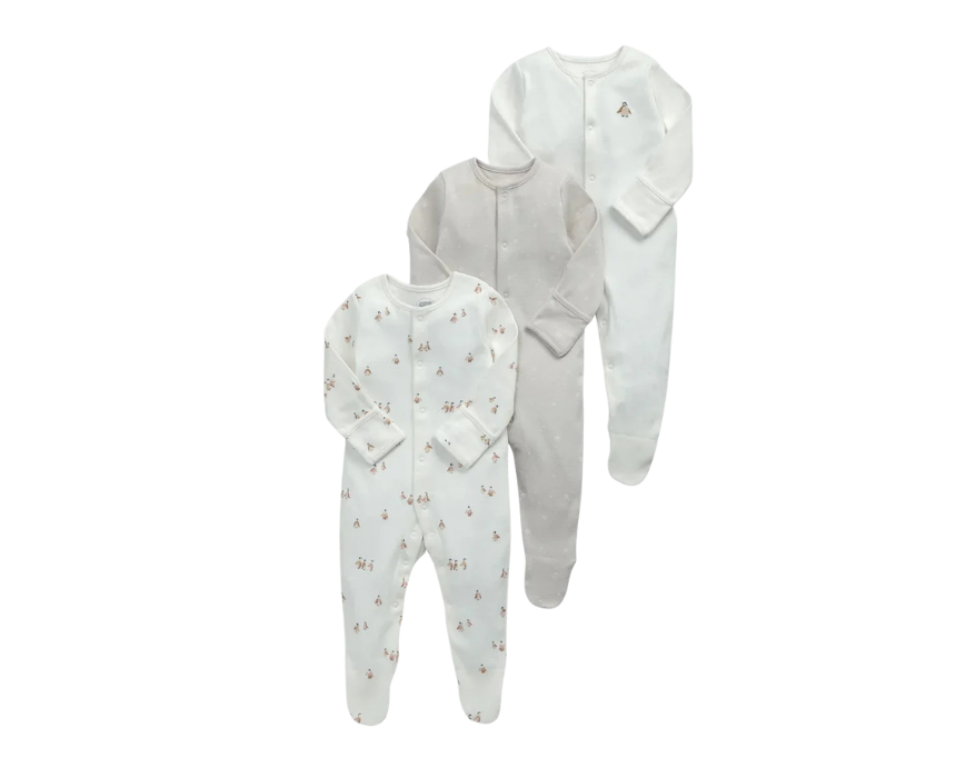 This 3-pack of baby sleepsuits features long sleeves, enclosed feet, and convenient front and gusset popper fastenings for easy dressing. Made from 100% soft cotton, the set includes charming penguin-themed prints with cloud and embroidery details. Comfortable and practical, it’s perfect for keeping little ones cozy during sleep or everyday wear.