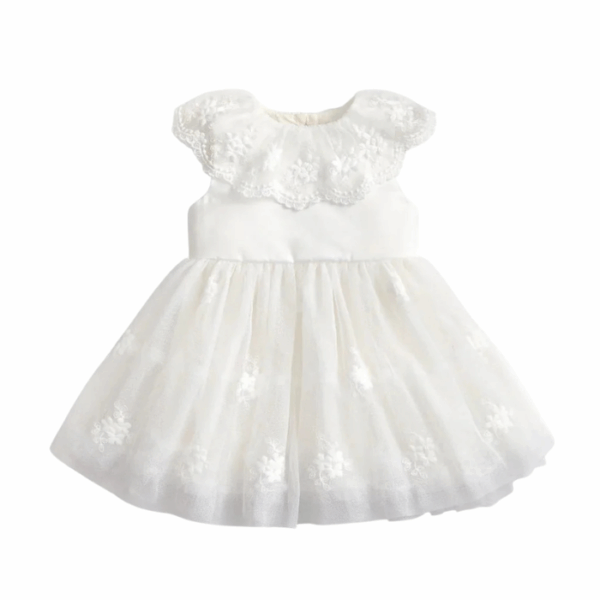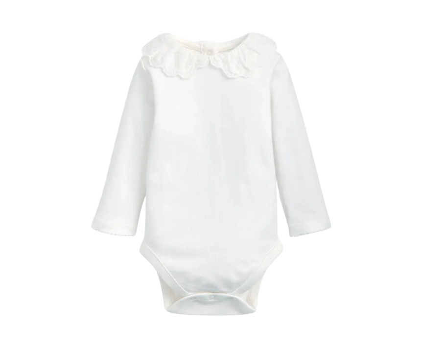 This baby white Peter Pan collar bodysuit features delicate embroidery on the collar, long sleeves, and popper fastenings at the back and gusset for easy dressing and nappy changes. Made from 100% soft cotton, it’s perfect for special occasions or dressy days.