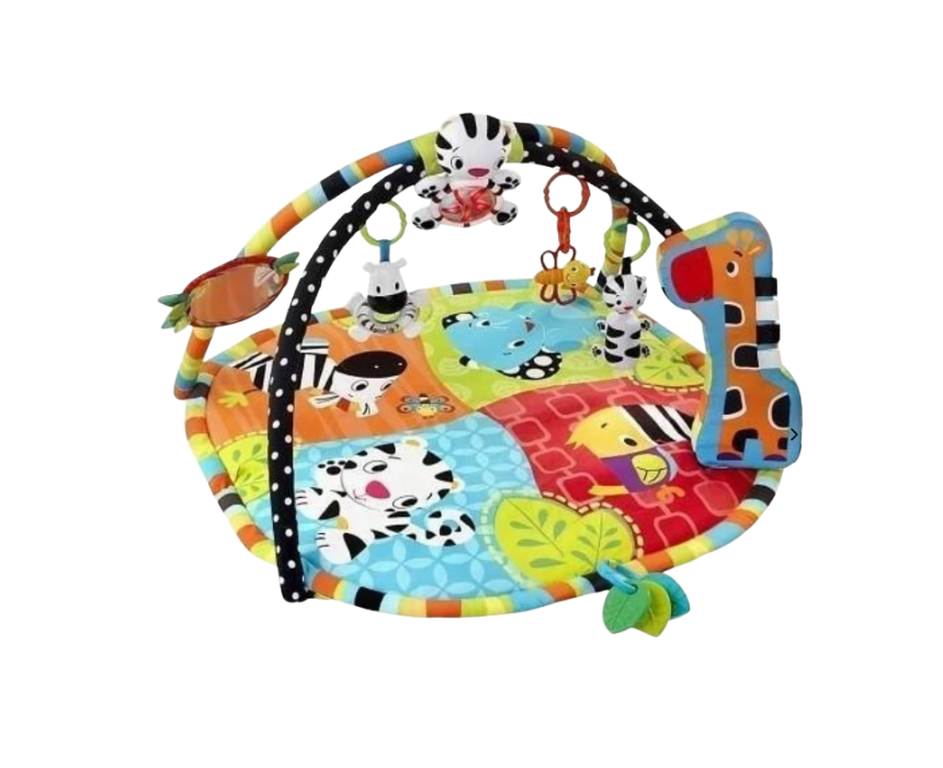 This baby play gym is designed to support early development through engaging sensory play and tummy time activities. It features a soft giraffe prop pillow for comfort, a light-up on-the-go tiger with melodies and sounds to stimulate hearing, and a large baby-safe mirror to encourage visual recognition. It can be placed on a flat surface during playtime and used daily to help improve motor skills, sensory awareness, and self-discovery in infants.