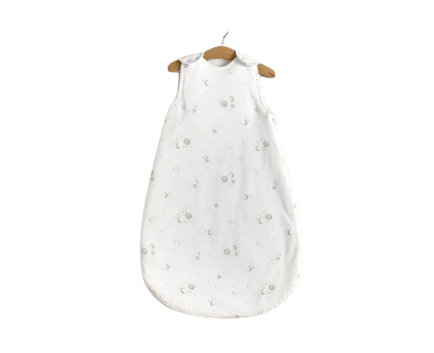 This baby sleeping bag is designed for newborns up to 6 months, offering a safe and comfortable sleep solution made from ultra soft breathable jersey cotton in a calming cosmic print. With a 2.5 tog rating, it helps maintain warmth during cooler nights while remaining gentle and breathable for healthy sleep. It features easy zip and shoulder button fastenings for quick dressing and convenient nighttime changes, making it ideal for cot or crib use.