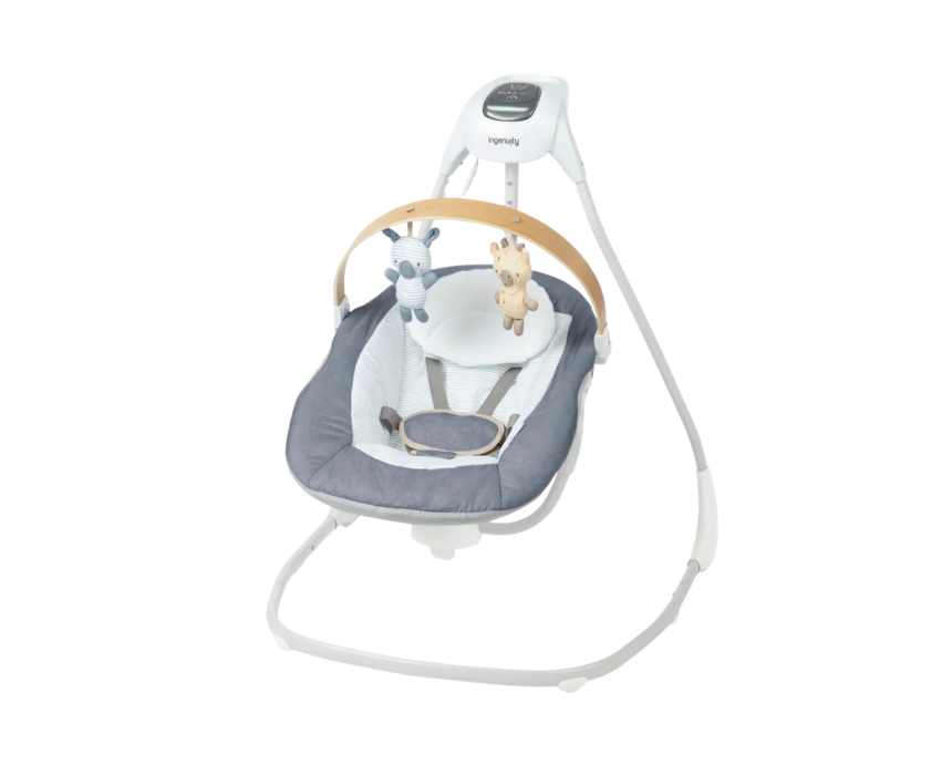 Designed for newborns, this compact baby swing seat offers a comfortable and calming space with multi direction swinging and adjustable speed settings for personalized soothing. It features a rotating toy bar with removable sensory toys, gentle vibration, and built in melodies and nature sounds to support relaxation and early stimulation. With a secure five point harness, removable washable seat pad, and lightweight portable frame, it is ideal for everyday use from birth up to nine months.