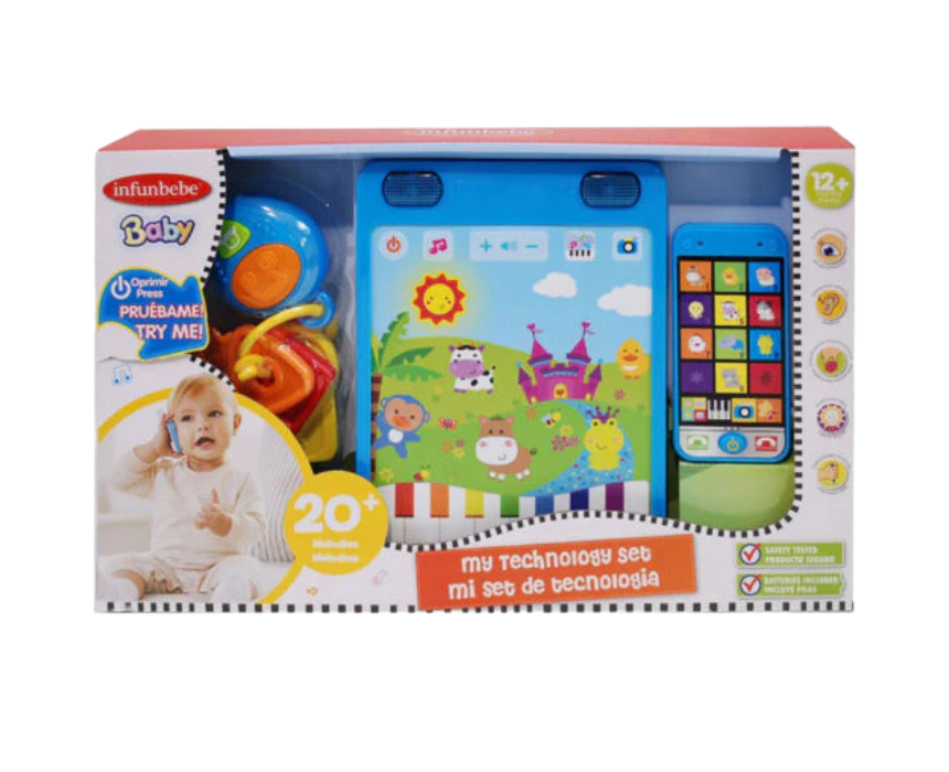 The Infunbebe My Technology Set is an interactive baby and toddler play kit designed to introduce early learning through colorful tech inspired pieces, buttons, and engaging sensory features. It supports cognitive development, fine motor skills, and hand eye coordination while offering fun indoor play that pairs well with everyday baby essentials.