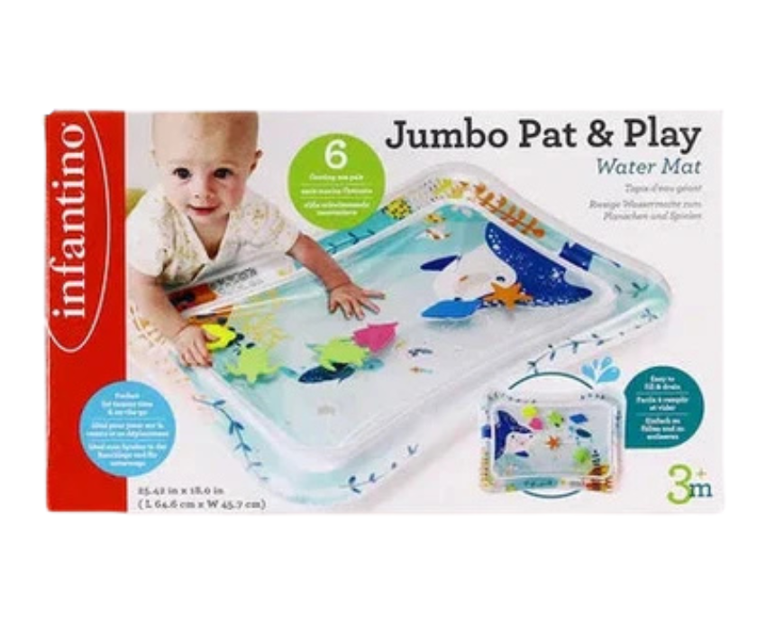 The Infantino Jumbo Pat & Play Water Mat is an oversized sensory play surface designed to make tummy time more engaging and comfortable for babies. Filled with floating shapes and colorful visuals, it encourages reaching, pressing, and movement to support motor skills and sensory development. Perfect for floor play at home, it creates a stimulating activity space that can be paired with other infant toys for added fun.