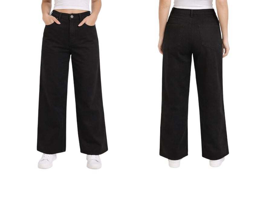 These black baggy jeans feature a high-waist fit and are made from super high-quality denim with full Lycra for added comfort and flexibility. Available in sizes 32, 34, 36, 38, 40, and 42, they combine relaxed style with easy movement. Perfect for day-to-night outfits when paired with boots or sneakers.