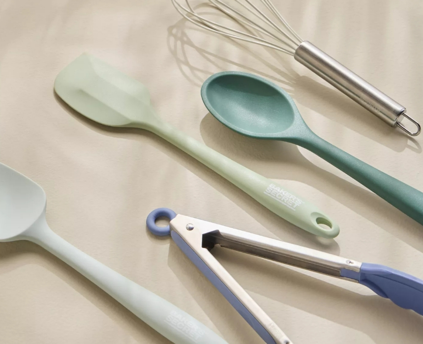 This five piece silicone kitchen tool set includes a spoon, two spatulas, tongs, and a whisk, crafted from durable heat resistant silicone. Gentle on non stick cookware, these tools prevent scratches while providing versatility for cooking and baking tasks. Practical and long lasting, this set makes meal preparation effortless and enjoyable for any home chef.