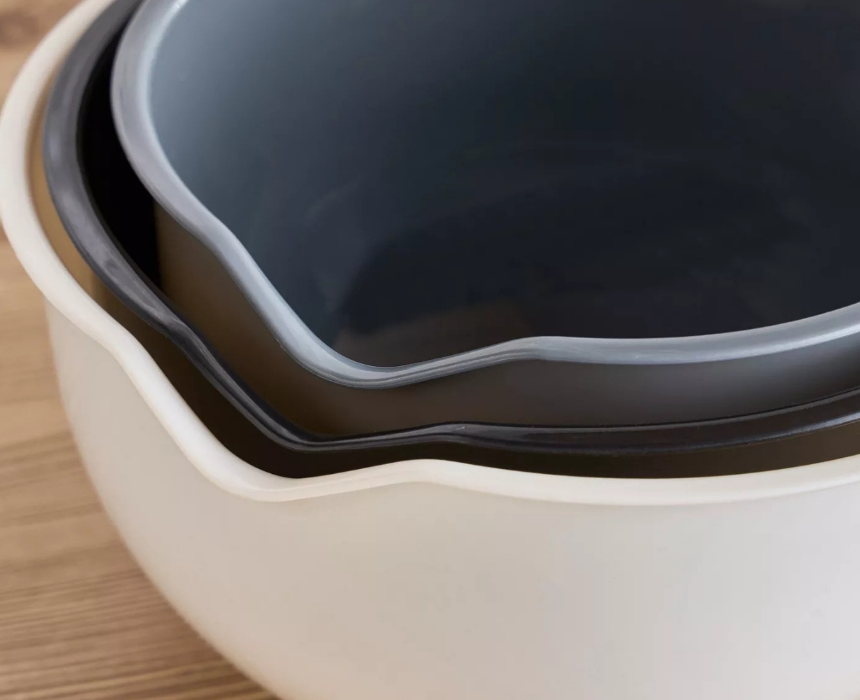 This versatile mixing bowl set includes three sizes: small 19.5 cm by 11.5 cm, medium 22.5 cm by 11.5 cm, and large 23 cm by 11.8 cm, perfect for preparing multiple ingredients. Designed with a nesting feature, the bowls allow compact storage and save cupboard space. Durable and practical, they are an essential addition to any kitchen for baking and cooking tasks.