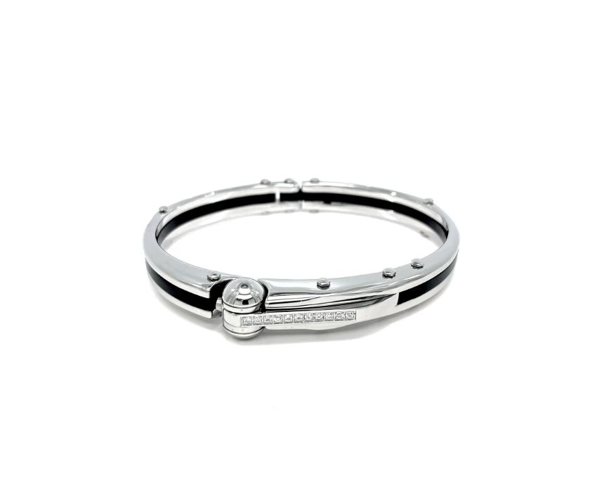 The Handcuff Men Bangle in Silver is an Italian made men’s bangle crafted from durable stainless steel with an elegant black and rhodium finish, accented by zircon stones. Measuring 6.8 cm, it’s a sleek accessory that enhances both casual and formal looks. Wear it solo for subtle sophistication or layer with other wristwear for a bold statement.