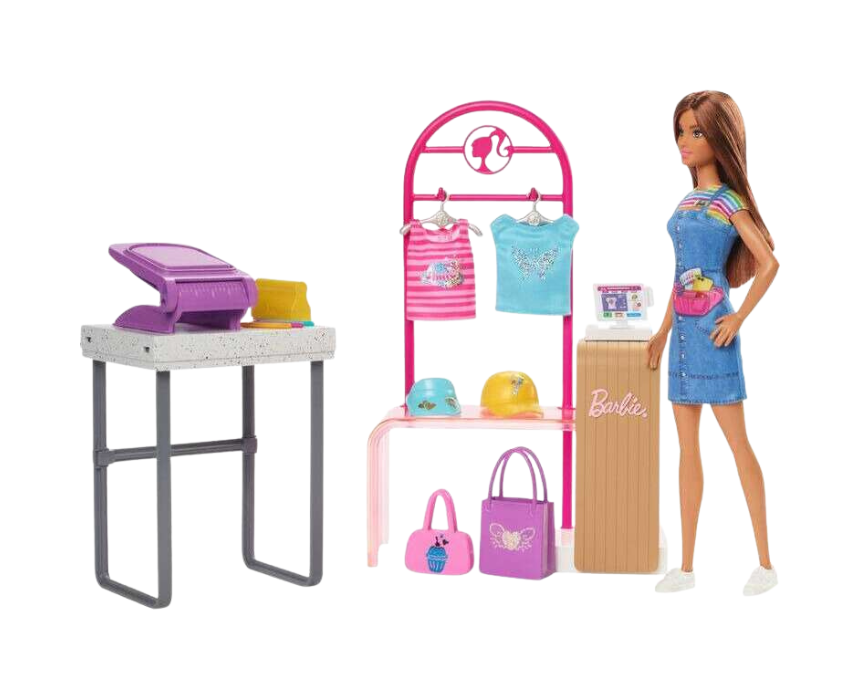 Encourage creativity with the Barbie Make & Sell Boutique set! Kids can design unique outfits with the easy-to-use foil screen-printing, then display and “sell” their creations using the boutique rack and checkout register. Includes a Barbie doll, stylish outfit, soccer ball, and storage cart for endless imaginative play.