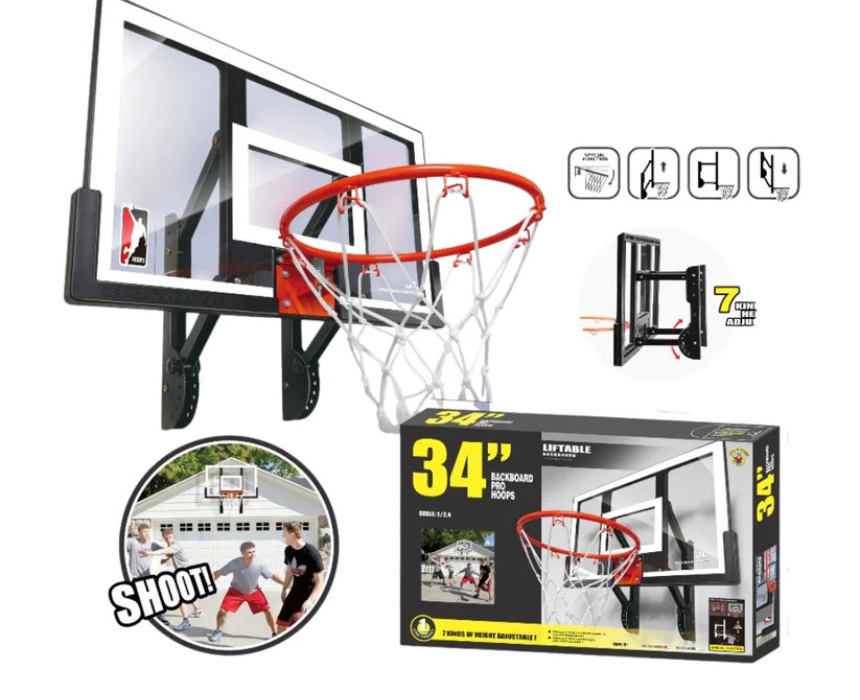 This wall mounted lifting basketball hoop features a durable high strength PC backboard and a 34 inch wide hoop designed for children. It can be mounted on a wall or over a door for safe indoor play, making it ideal for practicing basketball skills and looks best installed at a comfortable height in a bedroom or playroom for daily use.