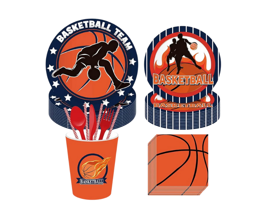 The Basketball Paper Set is a complete party kit featuring 8 × 9-inch plates, 8 × 7-inch plates, 20 napkins, 16 cups, and 25 straws, perfect for basketball-themed celebrations. Ideal for birthdays, sports parties, or fun gatherings, it adds a coordinated and playful touch to any table setup. Style it on party tables for an engaging and sporty décor that fans will love.