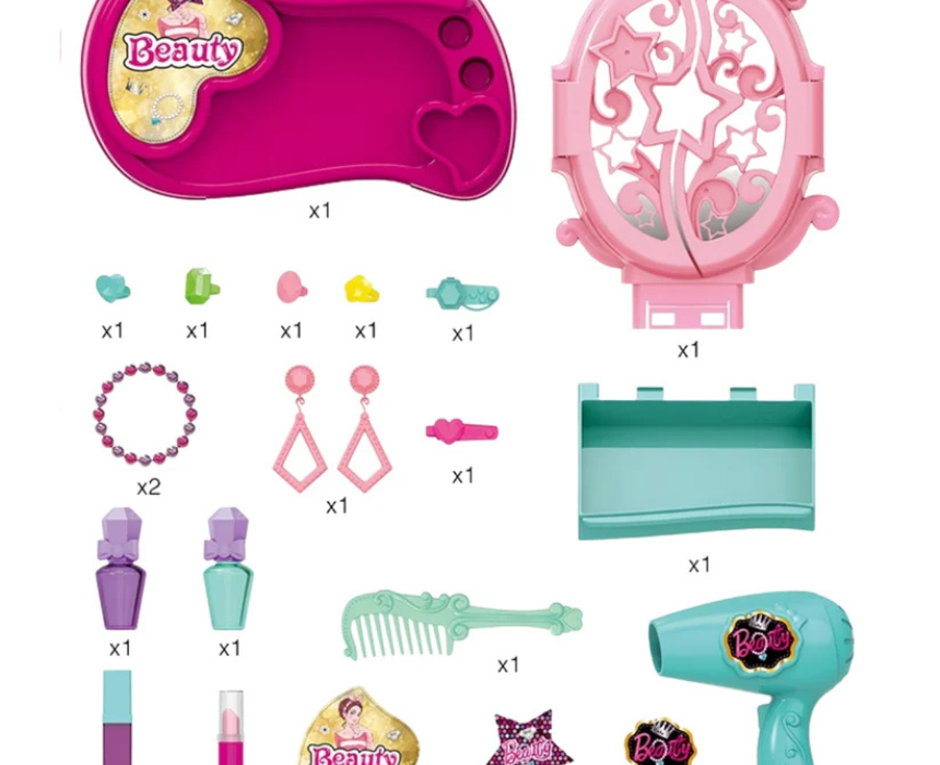 The Beauty Angel Pretend Play Vanity Set offers hours of imaginative beauty fun with 24 accessories, including a mirror, comb, blow dryer, hairbands, nail polish, and rings. Designed with engaging light and sound functions and a compact 47.5 cm × 31 cm × 27 cm size, it supports creativity, role-play, and fine motor skill development. Kids can style their look by wearing the rings and hairbands while pretending to get ready at their own vanity station.